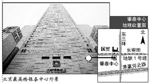 位于東三環(huán)國貿(mào)橋的西南角,矗立在長(zhǎng)安街的南邊,主樓高達(dá)249.9米。中國指數(shù)研究院的調(diào)查表明,銀泰中心是目前北京在售總高度最高的樓盤。