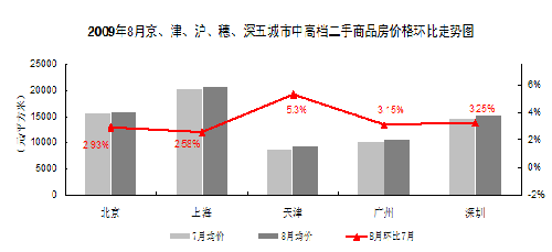 從圖表中的數(shù)據(jù)可以看出,2009年8月京、津、滬、穗、深五大城市的中高檔二手房?jī)r(jià)格均呈上漲走勢(shì)。在上述五大城市中,8月份中高檔二手房上海和北京分別上漲2.58%和2.93%?傮w來看,2009年8月五大城市中高檔二手商品房在市場(chǎng)成交活躍的促進(jìn)作用下,價(jià)格再創(chuàng)新高。價(jià)格上漲最明顯的依然是天津,上漲了5.3%。其次是深圳和廣州,分別上漲3.25%和3.15%。