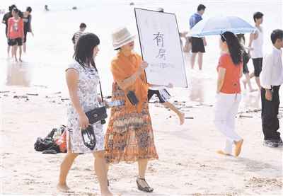 2月16日,農歷虎年正月初三,三亞市大東海海灘。一名“炒房”者打出廣告,轉賣花高價包下的酒店房間。春節(jié)前,她以每間房1500元的價格包下了某酒店初二到初五期間的10多間房,而平時這樣的房間標價在588元。讓這名“炒房”者沒想到的是,高價包來的客房卻賣不出去了,為了減少損失,她不得不在游人密集的地方打折賣房。旅游業(yè)內人士分析稱,三亞房價飆升有部分原因是旅行社和“黃牛黨”提前向酒店“買斷”一批高端酒店客房,然后待價而沽、大賺一筆。王凱 攝