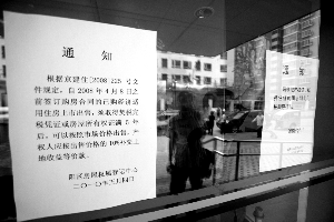 貼在玻璃門上的通知說:“根據(jù)京建住(2008)225號(hào)文件規(guī)定,自2008年4月8日之前簽訂購房合同的已購經(jīng)濟(jì)適用住房上市出售,須取得契稅完稅憑證或房屋所有權(quán)證滿5年后,可以按照市場(chǎng)價(jià)格出售,產(chǎn)權(quán)人應(yīng)按出售價(jià)格的10%補(bǔ)交土地收益等稅款。”