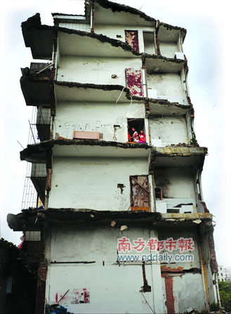 與租客不同,屋主比較擔(dān)心自身安全問題!捌綍r(shí)不起風(fēng)還好,一起風(fēng)我們就有些害怕!蔽葜鞣Q,他們一家三代6口人都住在這里,每次臺(tái)風(fēng)來臨滿樓都是大風(fēng),有一次甚至嚇得兒媳婦跑到賓館開房睡覺。屋主稱,這棟房屋是自己與表弟在1993年修建的,占地面積約有160多平方米,兩家各占一半。幾年前寶地康泰房產(chǎn)公司改造紅山村,表弟與開發(fā)商達(dá)成協(xié)議后搬走,自家卻沒能與對(duì)方談妥。去年6月6日,開發(fā)商將屬于表弟的那一半拆除掉,才出現(xiàn)如此的“半邊樓”。