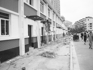 這排房屋從南車站路陸家浜路口延伸到南車站路麗園路口,全部建在人行道上,共有十幾個門面,曼延數(shù)百米。房屋高二層,目前還在施工,大量建筑材料散亂堆放(見圖 屠仕超 攝)。行人只能走上非機(jī)動車道、機(jī)動車道,與車流相伴。