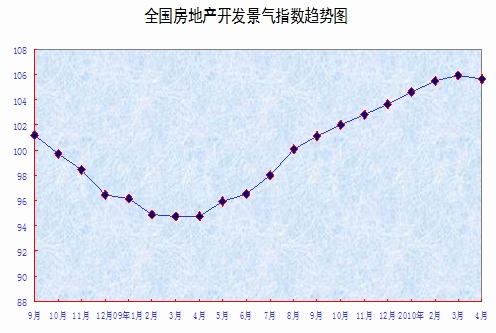 中新網(wǎng)5月11日電 據(jù)統(tǒng)計局網(wǎng)站消息,4月份,全國房地產(chǎn)開發(fā)景氣指數(shù)(簡稱“國房景氣指數(shù)”)為105.66,比3月份回落0.23點(diǎn),比去年同期提高10.90點(diǎn)。