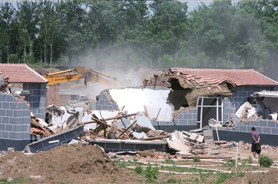 昨天,一輛巨型鏟車把通州區(qū)張家灣鎮(zhèn)棗林莊村一名叫“逸仙種植園”的違規(guī)農(nóng)家別墅群徹底鏟倒。100余棟耕地上蓋起來的小院在鏟車的巨爪下,紛紛倒地,成為今年以來通州區(qū)政府強(qiáng)拆的第二個(gè)大型農(nóng)家大棚別墅。