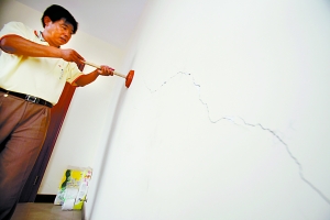 業(yè)主楊女士稱,2005年7月份交房,當年9月承重墻出現(xiàn)裂縫,此后裂縫越來越多,她向開發(fā)商反映后,開發(fā)商派人將裂縫鑿開深3厘米,寬約15厘米的槽,然后用水泥砂漿抹平。
