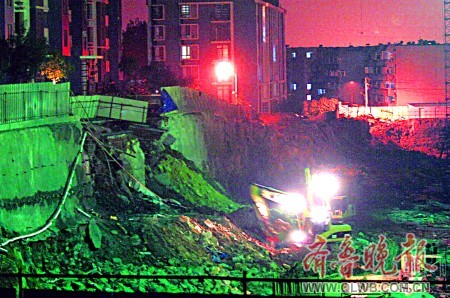 晚8點(diǎn)左右,記者趕到泉景天沅·秀園新建樓盤施工現(xiàn)場,這處工地南側(cè)緊挨著王女士居住的樓房。地基已經(jīng)挖到十幾米深,如刀切斧剁一般齊刷刷到底,橫截面上有一些用來加固土層防止坍塌的錨桿。根據(jù)記者目測,坍塌的地方長度約10米,土層從上到下一落到底(上圖)。為防止情況繼續(xù)惡化,施工方已經(jīng)采取了措施。兩輛渣土車正從挖出的土堆上往坍塌的地基處運(yùn)送土方,而兩臺挖掘機(jī)則把運(yùn)來的土方往坍塌處回填反壓。