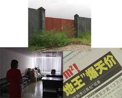 2007年9月11日,保利地產(chǎn)在一天之內(nèi)以8769和8112的高昂價(jià)格,拿下了這里的兩塊土地,成為地王,F(xiàn)在土地已經(jīng)被鐵皮墻包圍起來(lái)。大門門口雜草叢生,看起來(lái)很少有人光顧。我們找到了看守工地的施工人員。