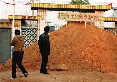 認為村委會未按照占地時的承諾為其置換土地,14日晚,村民靳先生雇車運來黃土,堵住豐臺區(qū)長辛店鎮(zhèn)大灰廠村村委會的大門。