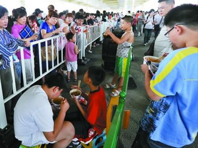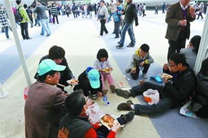 鴨脖子、雞爪、雞翅、黃瓜、雞蛋、面包……下午五點(diǎn)多,記者在園區(qū)看到,不少游客一家人攤開折疊椅,拿出包內(nèi)的食物開始野餐。沒吃一會(huì),女主人又買來4支冰激凌和若干串烤肉,一家人邊啃烤肉邊吃冰激凌,非常開心。 “我們一家人從江西南昌過來,早就聽說世博園內(nèi)到處都要排隊(duì),所以索性從家里帶了點(diǎn)吃的東西過來,主要是為了節(jié)約排隊(duì)用餐時(shí)間!迸魅诉呎f邊向記者展示她帶的食物。