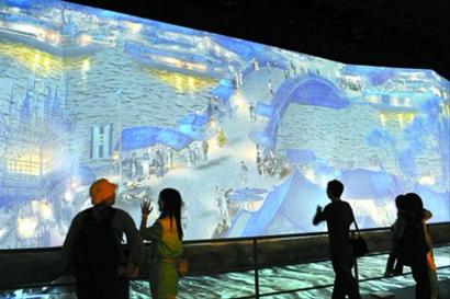 在其看來,這幅會(huì)“動(dòng)”的清明上河圖,表現(xiàn)了宋代汴京的繁華景象,當(dāng)年的小康生活、和諧生活的理念也隨之得到表現(xiàn),每個(gè)人會(huì)走、會(huì)動(dòng)、喝酒、聊天,這是利用現(xiàn)代技術(shù)把它做出來的。里面的水也是通過光效作用制成的,不是真正的水。