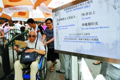 從今天(1日)起,世博園里75歲的老年人和行走不便的殘疾人享有走綠色通道的權利,而原先不少場館對孕婦和三四歲以下的兒童開放的綠色通道,從今天起不再適用。記者上午在世博園里看到,有一位孕婦模樣的游客欲走綠色通道時,被工作人員婉拒。