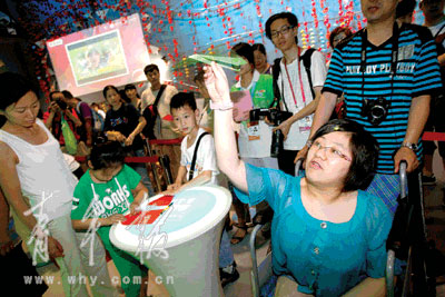 昨天上午,在世博局相關(guān)工作人員的安排下,不需要排隊(duì),通過(guò)媒體工作人員專用通道,小邢怡第一時(shí)間入了園。8點(diǎn)50分,邢怡來(lái)到了向往已久的中國(guó)館門前,早已等候著的中國(guó)館副館長(zhǎng)龔惠斌迎了上來(lái),熱烈歡迎小邢怡來(lái)中國(guó)館,龔惠斌副館長(zhǎng)還送了小邢怡一份小禮物,精致的世博徽章,還有介紹中國(guó)館的精美圖冊(cè)。小邢怡傻傻地笑著說(shuō)不出話,咧著嘴開(kāi)始了奇妙的中國(guó)館之旅。后來(lái)小邢怡悄悄告訴記者,一直看新聞上說(shuō)中國(guó)館預(yù)約券有多么的難得,參觀中國(guó)館有多么的不容易,她根本沒(méi)想到自己能那么幸運(yùn),所以剛進(jìn)中國(guó)館的那會(huì)兒,感覺(jué)像做夢(mèng)一樣。