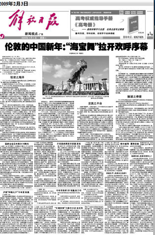 在謝斯百瑞大街,今年的中國新年慶;顒,以一種獨特的“海寶舞”拉開序幕。原來,慶;顒诱晟虾T趥惗嘏e辦世博會推介倫敦“上海周”,當?shù)厝A人華僑組織排練了“海寶舞”節(jié)目。隨著《微笑,說你好》的音樂響起,8個身著印有上海世博會會標衣服的來自上海的女華僑,在舞臺上舒展起優(yōu)美的舞姿。