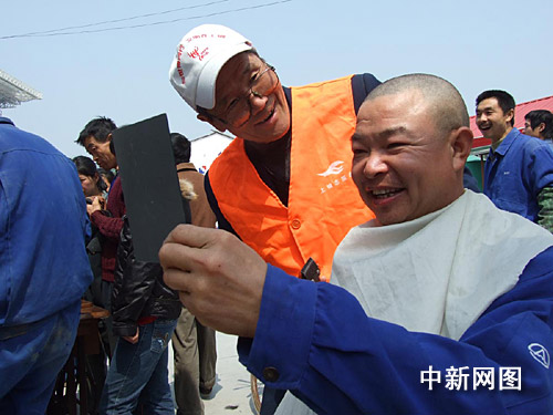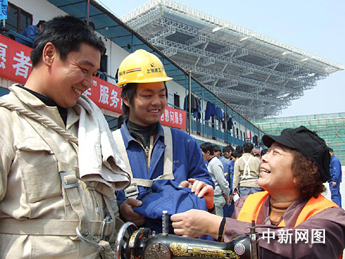 聽說服務(wù)“大篷車”要來,工地建設(shè)者早早作了準(zhǔn)備,穿破的衣褲,穿壞的鞋都拿了出來。一位來自河南,名叫張慶國的25歲民工,由于工地工作忙,已半年沒理發(fā)了,逢午飯休息間,他對(duì)理發(fā)的志愿者師傅說:“請(qǐng)幫我理了光頭吧,省得頭發(fā)長難受!10分鐘后,當(dāng)他拿著小鏡子,照著新理的光頭時(shí),高興地指著腦袋說:“這下可解決了”。一旁,兩位浙江籍青年拿著剛修補(bǔ)好的球鞋,笑得合不攏嘴!吧虾H苏鏌崆椋炙囈哺。我這修好的球鞋,看不出補(bǔ)丁,真得太好了!