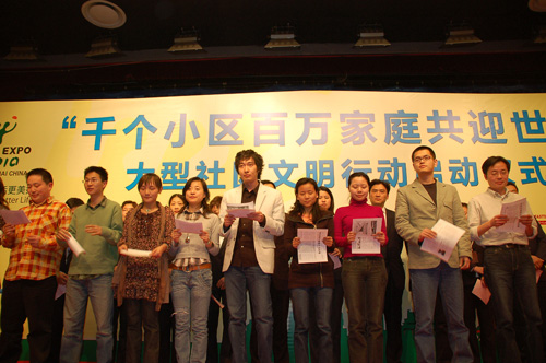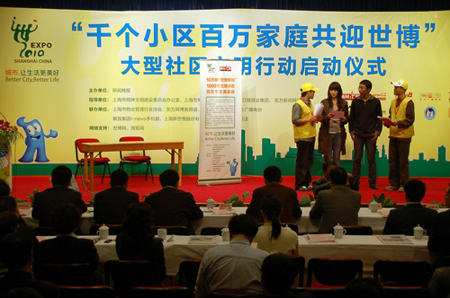 4月8日下午,“千個小區(qū)百萬家庭共迎世博”大型社區(qū)文明行動啟動儀式舉行。據(jù)悉,為了讓更多市民參與世博、服務(wù)世博,活動將從2009年4月一直持續(xù)到2010年10月結(jié)束。