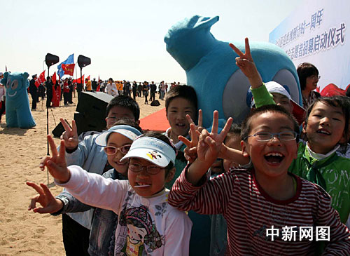 在上海金山城市沙灘,昨日,在上海金山城市沙灘,一群孩子爭(zhēng)相與2010年上海世博會(huì)吉祥物“海寶”合影。作 者:莊毅