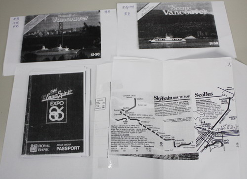 下面我分別談這兩件事的情況。當(dāng)我抵加拿大溫哥華,哥哥們 一定要我去參觀舉世矚目的1986年溫哥華世博會(huì)(EXPO),親友們很快為我購買了精致的入場券。因?yàn)槊看稳ビ密囕d我參觀,一參觀一整天(從上午10點(diǎn)到下午9點(diǎn)),我只去過兩次,去幾個(gè)國家地區(qū),每到一個(gè)地區(qū)、國家可蓋紀(jì)念章。這張入場券像一本護(hù)照,做得很精致,同時(shí)各個(gè)地區(qū)、國家有種種介紹的冊子。我要來不少冊子,后來在搬家中丟失了。這本“護(hù)照”留地方蓋當(dāng)日入場日期,并留了不少空白號蓋章用。我參觀了兩次(1986年5月26日及5月31日),我保存入場券上有蓋紀(jì)念章包括中國館、加拿大安大略省(法文地區(qū))、日本、馬來西亞、韓國、羅馬尼亞、加拿大、肯尼亞、澳大利亞、巴基斯坦等。我入場券號碼是0370014,首一頁是當(dāng)?shù)厥组L(籌備館負(fù)責(zé))歡迎詞,在第二頁上寫上自己的名字、地址及自己簽名,寫上三日護(hù)照(Three day passport)與皇家銀行(Royal Bank)合辦。并有一張1986年溫哥華EXPO導(dǎo)游圖,標(biāo)出80個(gè)地區(qū)、國家所在。我還有保存兩本介紹溫哥華風(fēng)景小冊子,每一本冊子包括14個(gè)風(fēng)景區(qū),每本定價(jià)1.5元。