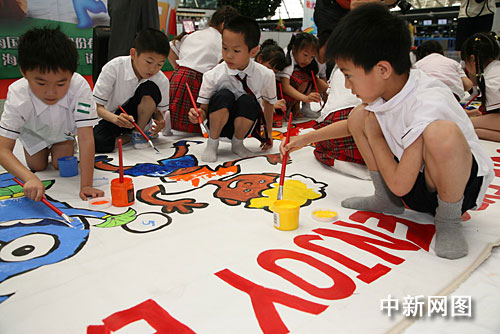 孩子們?cè)谑啦┲黝}表演中拉開(kāi)了活動(dòng)序幕。隨后,來(lái)自五洲四海、有著不同的膚色和語(yǔ)言的孩子們?cè)?0米長(zhǎng)卷上現(xiàn)場(chǎng)繪畫(huà),他們用靈巧的雙手畫(huà)出了世博吉祥物海寶、東方明珠、浦東機(jī)場(chǎng)等上海標(biāo)志性建筑,用豐富的想象勾勒出心中理想的城市,用自己的小手做畫(huà)筆印在畫(huà)布上,形象、天真地詮釋了“城市,讓生活更美好”的世博主題,表達(dá)了對(duì)2010年上海世博會(huì)的期待和向往。