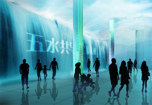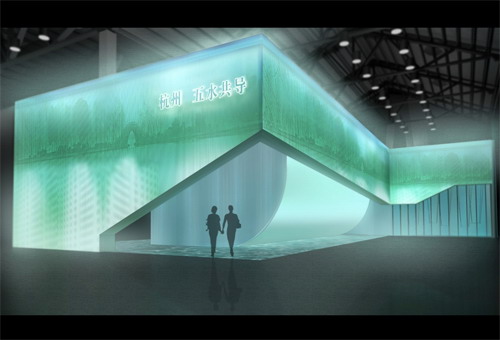 杭州館展區(qū)外立面采用城市方舟的設(shè)計(jì)主題,五水共導(dǎo)的水幕卷蓬猶如偉岸的城市方舟從中駛出,使參觀者在遠(yuǎn)距離就能感受到展館的氛圍。最新的光電技術(shù),將營(yíng)造出一個(gè)晶瑩剔透水晶般的展館,并以醒目的位置,展示獨(dú)特的杭州城市標(biāo)志。此外,弧型的水幕若隱若現(xiàn),當(dāng)參觀者踏入展館的那一刻,周圍以及頭頂環(huán)繞的環(huán)境將共同營(yíng)造出一座聞名中外的山水城市。