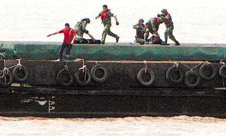 “跳幫!”一聲令下,10余名海警官兵利用兩船靠近和波浪起伏間隙最小的瞬間,飛身魚躍,紛紛越過(guò)船艇護(hù)欄,跳到貨輪上。海警擊斃一名“恐怖分子”,制伏兩人,另一名“恐怖分子”慌不擇路跳海,也被飛身入海的海警抓獲。此時(shí)藏匿在機(jī)艙的4名“恐怖分子”瞅準(zhǔn)空隙,駕艇逃竄。