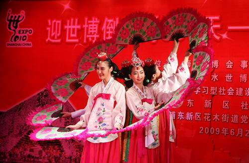 6月27日下午,上海市浦東新區(qū)花木社區(qū)文化活動(dòng)中心熱鬧非凡,熱烈的掌聲和歡快的音樂聲不時(shí)地響起,由上海世博局和2012年韓國(guó)麗水世博會(huì)組委會(huì)聯(lián)合主辦、上海市學(xué)習(xí)型社會(huì)建設(shè)服務(wù)指導(dǎo)中心和浦東新區(qū)社區(qū)學(xué)院協(xié)辦的“迎世博倒計(jì)時(shí)300天——中韓民眾社區(qū)大聯(lián)歡”活動(dòng)正在這里舉行。麗水世博會(huì)組委會(huì)秘書長(zhǎng)金丙一、韓國(guó)駐滬副總領(lǐng)事延上模、上海世博局副局長(zhǎng)朱詠雷、上海市學(xué)習(xí)型社會(huì)建設(shè)服務(wù)指導(dǎo)中心副主任王連華等出席活動(dòng)。