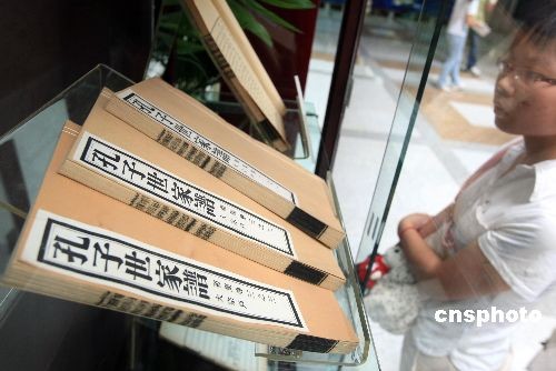 7月14日,在滬舉行的“尋根稽譜——上海圖書館藏家譜精品展”上,一部《孔子世家譜》吸引了眾多參觀者的目光。這部記載孔子后裔達(dá)七十余世的家譜,因其記錄的連續(xù)性和完整性,以及嚴(yán)謹(jǐn)?shù)捏w例、翔實(shí)的資料,號(hào)稱“天下第一譜”。 據(jù)介紹,上海圖書館現(xiàn)藏有中國家譜近2萬種20萬冊(cè),共計(jì)365個(gè)姓氏,是國內(nèi)外收藏中國家譜原件最多的公藏機(jī)構(gòu)。這次展出的60件展品,都是從館藏中挑選出來的精品。中新社發(fā) 湯彥俊 攝