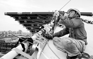 下午兩點,記者帶著溫度計來到世博工地外國館片區(qū),陽光下,水銀柱停留在40攝氏度上。走上5分鐘,汗水濕透了全身。高溫挑戰(zhàn)著每個建設(shè)者的意志力。在法國館將要完成的鋼結(jié)構(gòu)屋頂上,幾個工人正在安裝最后的鋼架,為了避免曬傷,他們穿著長袖長褲的工作服,戴著安全帽。從屋頂爬下來時,每個人都像是剛從水里撈上來的。工人老張說,安全帽不能脫,汗水一刻不停地沿著帽子流下來,眼睛都睜不開,得一直用手擦。