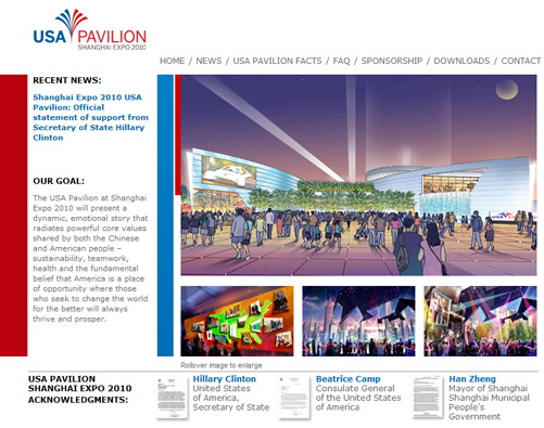 通過“最新動態(tài)”,網(wǎng)友可以清晰、直觀地了解美國館每一步的籌備動態(tài);而在“美國館概況”欄目中,網(wǎng)站全面介紹了美國館的理念、組織方及參展目標(biāo)等。此外,該網(wǎng)站還特別刊登了美國國務(wù)卿希拉里•克林頓等簽發(fā)的關(guān)于美國參與2010年上海世博會的信函。