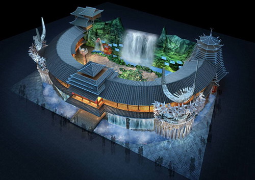 貴州館平均高度為7.2米,極端高度達(dá)8.5米,展示主題為“醉•美貴州,避暑天堂”。在600平方米的展示面積中,將貴州的自然山水和多元民俗文化巧妙結(jié)合,抽取風(fēng)雨橋、鼓樓、苗寨、銀飾和山水瀑布極具貴州特色的視覺元素,高度凝煉貴州人文自然風(fēng)貌以及“醉•美”和“避暑”的特色。強(qiáng)烈的視覺沖擊力和民俗特色,力求使絕大多數(shù)不了解貴州或從未踏足過貴州的參觀者,也能在第一時(shí)間內(nèi)對貴州館留下深刻的印象。