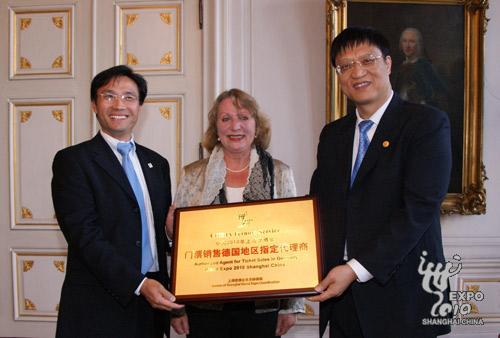 德國(guó)當(dāng)?shù)貢r(shí)間8月29日,中國(guó)2010年上海世博會(huì)門(mén)票銷(xiāo)售德國(guó)指定代理商授牌儀式在德國(guó)亞琛市政廳舉行。上海世博局副局長(zhǎng)陳先進(jìn)代表上海世博局向德國(guó)西馬遠(yuǎn)東服務(wù)公司總經(jīng)理左軍授牌。德國(guó)亞琛市副市長(zhǎng)西爾特(Scheidt)女士等出席授牌儀式。
