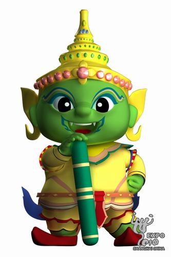“小阿泰”名字來(lái)自泰語(yǔ)的“THAI”(自由和獨(dú)立),設(shè)計(jì)靈感來(lái)自守護(hù)在泰國(guó)寺廟門前的泰國(guó)守門神夜叉“INTARACHIT”塑像,這個(gè)可愛的小巨人以他彬彬有禮、充滿歡樂的微笑象征著泰國(guó)人的熱情好客。“小阿泰”的綠色皮膚代表富饒的泰國(guó)大地,橢圓形的大眼睛如同泰國(guó)人友好和善良的心靈窗口,自然純真的微笑充滿著溫馨和友善,手握的巨棒具有創(chuàng)造幸福、實(shí)現(xiàn)夢(mèng)想的神奇威力。