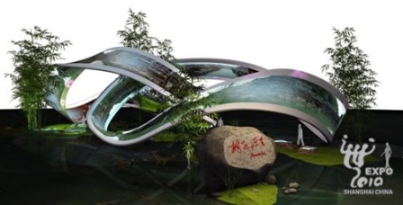 湖南館取名為“桃花源里·Xanadu”——Xanadu英文意為“世外桃源”,是西方世界描述神秘仙境時最廣泛使用的詞。湖南館的展示主題是“都市桃花源”。展館外觀之所以采用雙“魔比思環(huán)”相扣的造型,是取義無窮大符號“∞”和中國太極,這與和諧自然的中國理想城市意境以及長株潭城市群“兩型社會”的理念相契合!澳П人辑h(huán)”是雙環(huán)環(huán)繞,就單環(huán)而言展開長度達100米,高3米,只有一個面和一個邊界。由于主體造型是不規(guī)則的建筑環(huán)體,對施工和投影都帶來了重大挑戰(zhàn)。