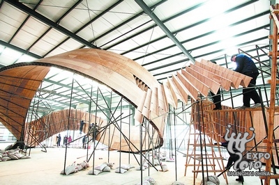 據(jù)悉,目前湖南館的地臺的鋼架、環(huán)體的胎架和其中一個環(huán)體以及投影機的桁架已經(jīng)基本完成,也將于近期啟運到上海。相關的后續(xù)搭建工作計劃于4月15日前完成并投入試運營。整個展館的組裝過程將歷時近100天。