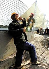 老葛告訴記者,一年前他剛“混”進(jìn)園區(qū),不是賣燒酒,而是賣啤酒。夏日炎炎,有個(gè)世博軸上的江蘇技工幾乎每天都來光顧,喝啤酒就像喝水一樣。江蘇工人喝多了,話也多。他告訴老葛,自己成天吊在繩索上,趴在上面倒騰的“大喇叭”,叫陽光谷。