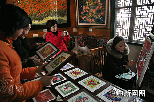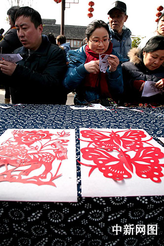中新網(wǎng)上海2月18日電 在上海金山著名文化古鎮(zhèn)楓涇,一場(chǎng)由金山農(nóng)民畫(huà)家和游客共同參與的繪世博題材農(nóng)民畫(huà)、剪世博窗花PK賽,17日在位于該鎮(zhèn)中國(guó)農(nóng)民畫(huà)村和古戲臺(tái)舉行。