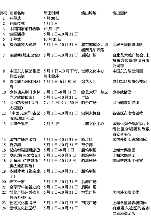 上海世博會(huì)期間,世界各地表演團(tuán)體將帶來2萬多場文藝演出和活動(dòng)。由東道主組織的19項(xiàng)盛大演出也已準(zhǔn)備就緒,開幕第一天起陸續(xù)在世博園全新的文化中心、綜藝大廳、綜藝廣場、后灘廣場、船臺(tái)廣場、寶鋼大舞臺(tái)、育樂灣、船塢劇場、博覽廣場、市民廣場一一亮相,生動(dòng)演繹各國傳統(tǒng)和文化,盛情邀請(qǐng)各國來賓分享和互動(dòng)——