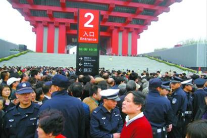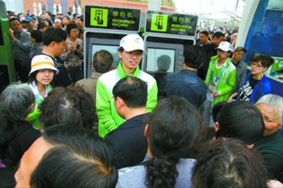 上午9時(shí)許,記者來到位于亞洲廣場兩個(gè)最靠近中國館的預(yù)約點(diǎn),近20臺(tái)預(yù)約機(jī)滿負(fù)荷運(yùn)作,可排隊(duì)等候的長龍還是一直蜿蜒到了人行通道上。記者了解到,短短一個(gè)小時(shí)里,中國館一天5萬個(gè)參觀名額幾乎全部滿額。