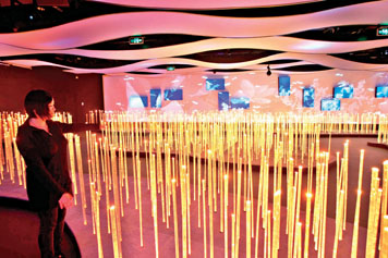 該館整體LED燈管約有11萬米,能夠形成三維的顯示矩陣。從5月1日開始,每天晚上閉館之前,將有這樣一個(gè)8分鐘左右的秀。經(jīng)歷一個(gè)“魔方”蘇醒的過程,觀眾會聽到“魔方”的“心跳”,當(dāng)“讓我們蕩起雙槳”音樂片段配合著企業(yè)聯(lián)合館的三維畫面,過去的片段在腦海中浮現(xiàn)。