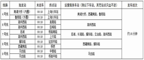 軌道交通4、6、7、8、9五條涉博線路在常規(guī)末班車后,將在世博園周邊站點加開加班列車,除重點涉博車站以外,其他途經(jīng)車站只可下客出站,不可進站上客和換乘。加開列車末班車時間為0:10,運營間隔約為15分鐘一班。具體車站的首末班車時間還可查看各車站公告、至上海地鐵官網(wǎng)(/) 進行查詢或撥打地鐵服務(wù)熱線64370000進行詢問。