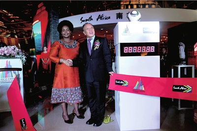 南非世界杯將于6月11日開幕,這是世界最高級(jí)別的足球盛會(huì)首次踏足非洲大陸。世博會(huì)南非館開館儀式上,李肇星與南非國(guó)際關(guān)系與合作部長(zhǎng)馬沙巴內(nèi)共同摁下了南非世界杯的倒計(jì)時(shí)牌!笆澜绫陂g,世博會(huì)南非館將不間斷播放世界杯比賽,歡迎大家來(lái)看!”馬沙巴內(nèi)向參觀者發(fā)出了邀請(qǐng)。
