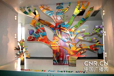 講解員:這個(gè)造型是孩子們眼中的城市,它是一個(gè)可以挪動(dòng)的城市,這是一個(gè)烏龜,可以拉他們到全世界去跑。