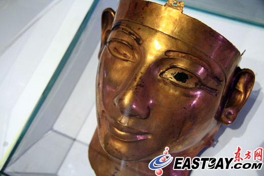 據(jù)介紹,“法老舍松契二世面具”誕生于公元前890年,在東尼羅河三角洲地帶被發(fā)現(xiàn)。黃金面具的左眼有一塊黑色,類似于眼珠,工作人員告訴東方網(wǎng)記者,可能是彩色涂料的殘留物,“這個面具的眼睛、眉毛等處在當時應(yīng)該有被涂上彩色顏料!