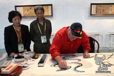 除制瓷以外,參觀寶鋼大舞臺的外國游客還常常熱衷于剪紙、織錦、皮影、旗袍等中國傳統(tǒng)文化,常常盯著一件作品看上老半天,如果碰巧遇上創(chuàng)作演示,更是不看到成品不罷休。每逢這時,獻(xiàn)藝的各位工藝大師總是會熱情地邀請他們親自試一試,剪下一朵花,或畫下一尾魚,體驗(yàn)中國文化的奇妙。大師們頗有心得地說,語言不是障礙,微笑就是最好的溝通。