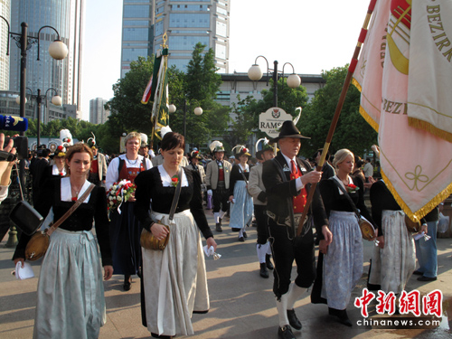 中新網(wǎng)南京5月23日電(申冉 閆正偉)今天下午,南京市中心山西路的市民廣場(chǎng)上空飄蕩著來(lái)自?shī)W地利美麗山崗原野間的優(yōu)美圓舞曲,穿著奧地利民族服裝的奧地利施瓦茨市長(zhǎng)樂(lè)團(tuán)樂(lè)手們帶著他們淳樸悠揚(yáng)的旋律和歡快自由的舞步,給南京市民送來(lái)了一個(gè)充滿(mǎn)著奧地利音樂(lè)狂歡節(jié)日氣氛的初夏周末。