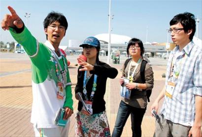 昨天,華東師范大學(xué)的志愿者吳子焰(左)正在向華東理工大學(xué)幾名志愿者介紹園區(qū)的情況。當日,吳子焰和許多第二批世博園區(qū)志愿者一樣,順利完成了任務(wù)。 本報記者 邵劍平 攝