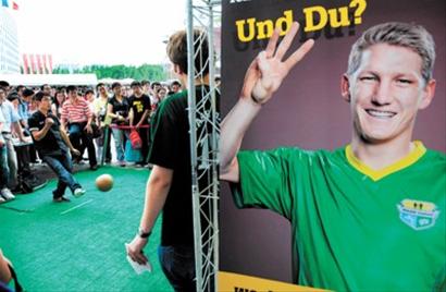 南非館前的籠式足球游戲成為園區(qū)最熱門的互動(dòng)項(xiàng)目之一。雖然獎(jiǎng)品只是世界杯紀(jì)念水壺,可球迷們都表示不是沖著獎(jiǎng)品去的,幾小時(shí)內(nèi)數(shù)百人在鐵籠中大秀腳法。期間,也有外國(guó)游客躍躍欲試。一名叫卡爾的德國(guó)男子看到足球就來勁,上前擺出的架勢(shì)頗為專業(yè),最后還是三次全部踢偏。