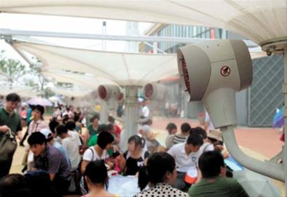 上午園區(qū)開放后,記者看到不少游客并沒有急著參觀展館,而是在遮陽棚下的長凳上小憩、喝水、抹防曬露。而撐著遮陽傘排隊幾乎成為“普遍規(guī)律”,太陽鏡、遮陽帽也成為參觀者的“標準配置”,有些游客甚至帶著濕毛巾擦汗、降溫。園區(qū)內的公園、綠地以及多處噴霧、透水地面、遮陽棚等場所、設施的降溫作用明顯,受到游客歡迎。