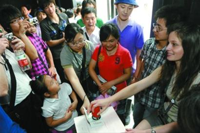 游客們親切地叫她“美女”,只是不知道她的名字。昨天采訪中,這位“最美敲章員”說(shuō),她叫米娜,之所以投身世博會(huì)工作,是因?yàn)闊釔壑袊?guó)的文化。
