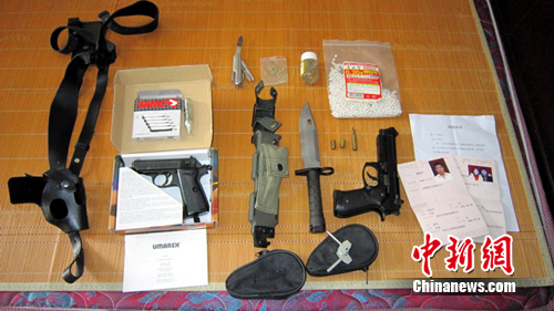 7月9日上午,義烏市公安局刑偵大隊(duì)技術(shù)員前往犯罪嫌疑人胡益華在金華的住處進(jìn)行進(jìn)一步調(diào)查時(shí),從該處搜出仿真槍兩支、軍用子彈一顆、彈殼兩枚、銅子彈及塑料子彈若干、軍用匕首一把、槍套一副、手銬鑰匙兩個(gè)等違禁物品。
