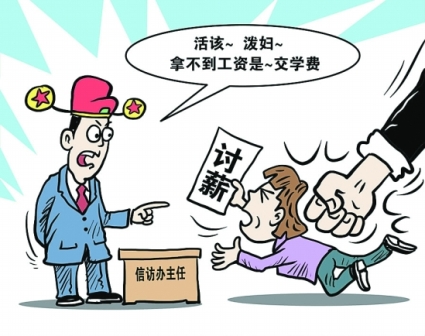 27日,因東莞市東城區(qū)“藏寶國際大酒店”拖欠裝修工人工資,工人拉橫幅上街討薪,兩工人被不明身份的黑衣人毆打。28日,東城區(qū)政府信訪辦就此舉行協(xié)調會,會上工人提及被打一事,主持會議的信訪辦主任葉柱權說是“活該”,他情緒激動,拍桌子罵女工人為“潑婦”,稱工人拿不到工資是“交學費”。(相關報道見今日A14版)